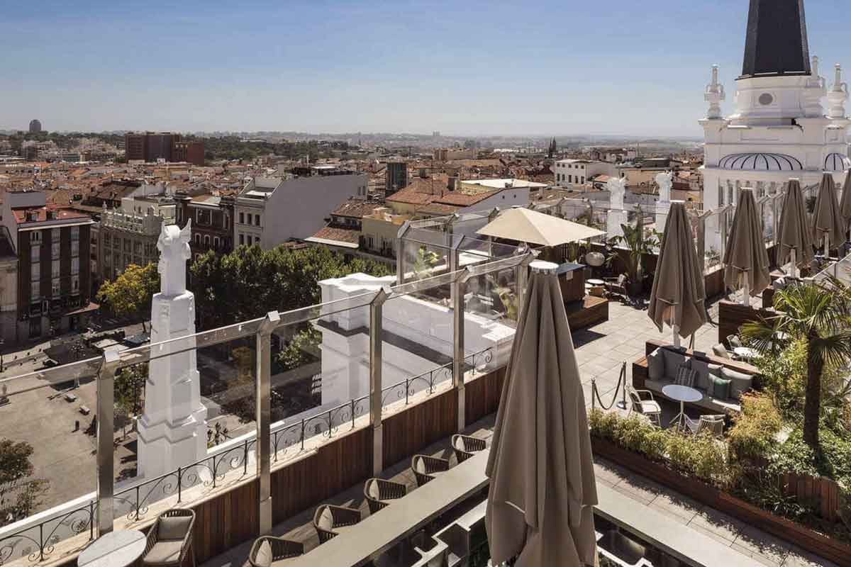 Las vistas desde ella son increíbles porque se puede contemplar una panorámica espectacular de la ciudad española y además, la decoración es muy llamativa. Crean un gran efecto visual utilizando el color morado fuerte que contrasta con las mesas de mármol y el suelo color crema.  Por la noche, desde la plaza de Santa Ana, esta terraza en lo alto del hotel llama mucho la atención. Amplia tu información en este enlace